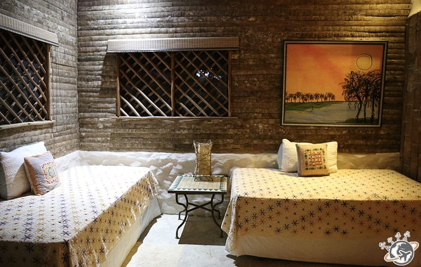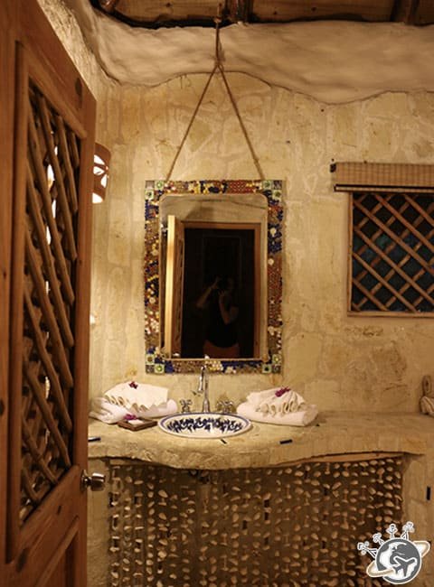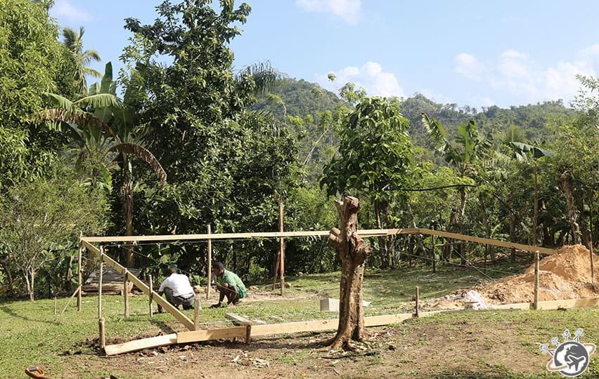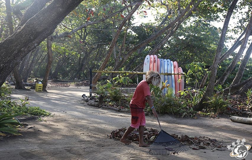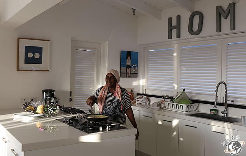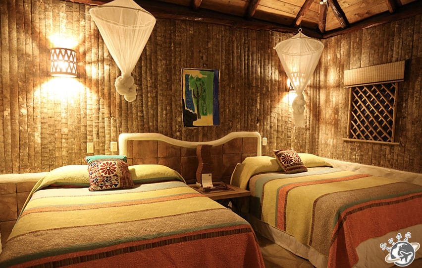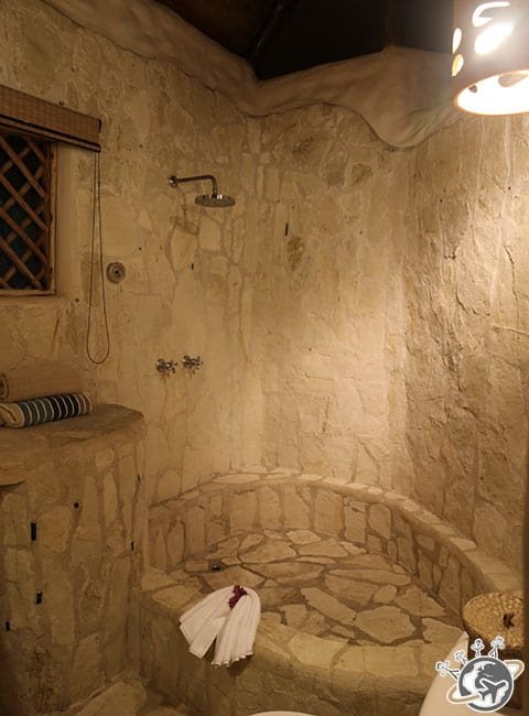 Dans les chambres, pas de fenêtres mais des moustiquaires et des stores pour le soir. On vit donc avec le soleil et les bruits/cris des animaux. Pour la douche, il faut penser à appuyer sur un interrupteur 20 minutes avant de la prendre, sinon… ben c’est froid. Une fois qu’on l’a trouvé ça va, mais certaines cherchent encore 🙂