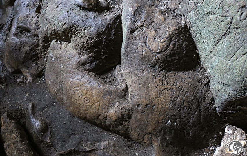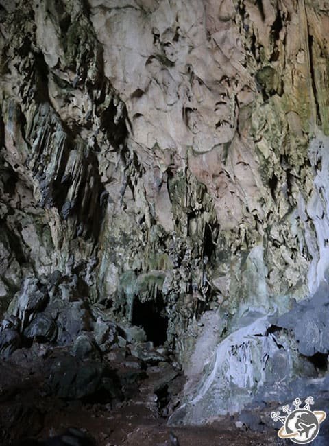 Dans la première partie, on suit le guide à la trace car il fait très sombre. On observe stalactites et stalagmites à la lueur du téléphone portable. Dans la seconde, il y a plus de lumière, on découvre en plus des dessins précolombiens sur la roche.