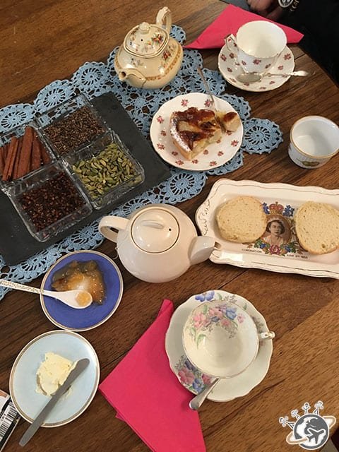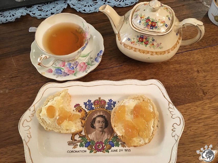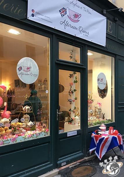 Du coup quand j’ai appris l’existence d’Afternoon Queens, un tea shop à la gloire de la famille d’Angleterre, je m’y suis précipitée… une fois les Nains partis. Parce qu’un tea time dans les règles de l’art, ça s’apprécie dans le calme. Nous avons choisi nos gâteaux, tarte poire amande pour Népoux et scones pour moi, les meilleurs du monde (au moins) puis nos thés, Lapsang Souchong et Green Gunpowder.