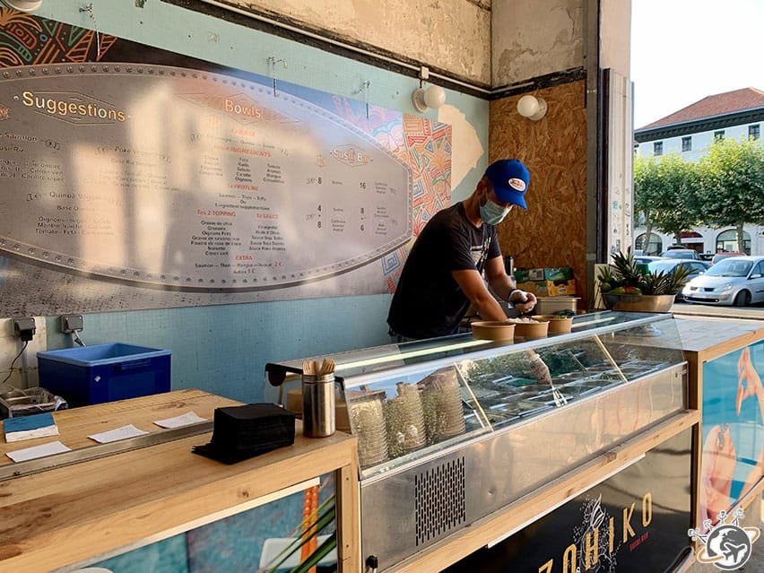 8 stands, 2 bars, 1 terrasse… le tout au même endroit, à 2 pas du port de Saint-Jean-de-Luz ! Cet endroit unique s’appelle le Garage et c’est parfait quand on n’a pas tous envie de manger la même chose. Et chez nous c’est toujours comme ça entre les flexitariens et la végétarienne.