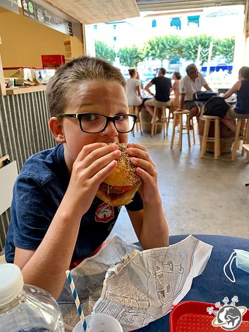 Beaucoup des rues perpendiculaires qui partent de la rue Gambetta mènent à la plage centrale. C’est là que se cachent beaucoup de restaurants… qui ne sont pas donnés et proposent très peu de plats végé. Alors on avait préféré un petit vendeur de panini. Avant de trouver le Garage.