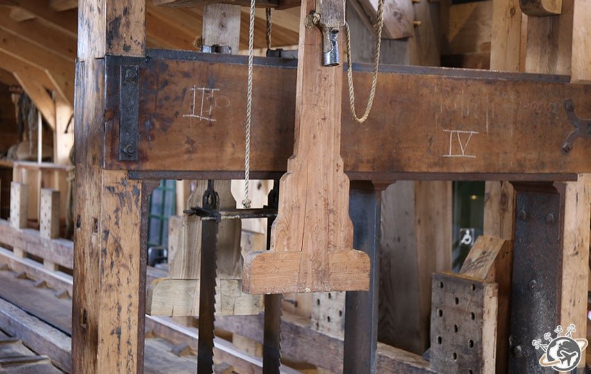 Nous commençons notre visite de ce moulin par un petit film qui nous raconte les 2 années de travaux qui ont suivi sa réhabilitation en 2005. Il avait été détruit en 1942. Depuis 2007, il scie sans arrêt.
