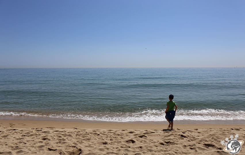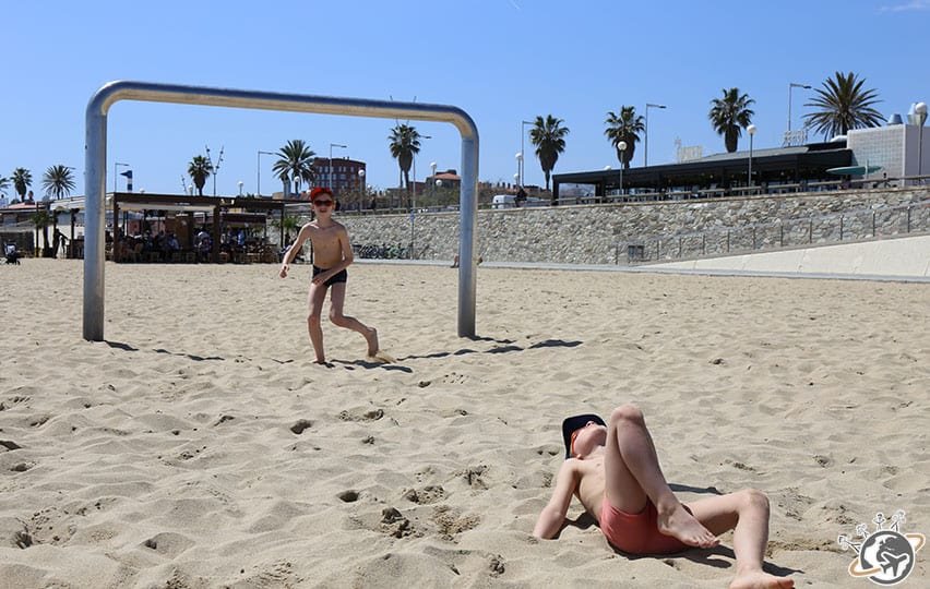 J’ai choisi Bogatell, qui m’a paru le bon compromis en terme de quiétude et de distance par rapport à notre appartement. Quelques stations de métro et de bus plus tard (on va à la plage en métro et en bus !!! quand je vous dis que je ne m’en remets pas), nous voilà arrivés sur ce que j’appelle une plage de rêve : sable blanc, mer transparente, longue, large et surtout peu de monde.