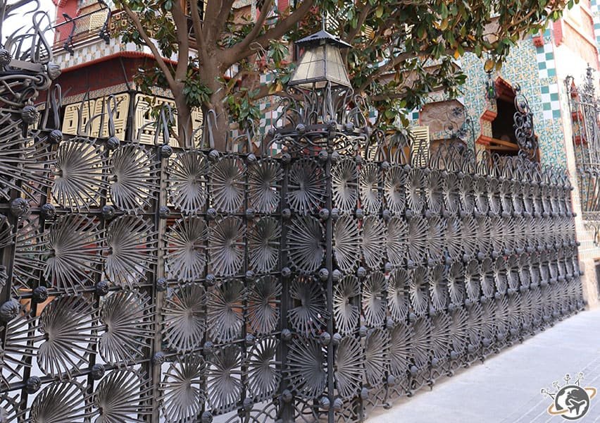 C’est la première commande importante de Gaudí. Elle ne ressemble pas du tout aux Casa Mila et Batlló, il y a des lignes droites (sacrilège :)) mais la nature est quand même présente, notamment sur le portail/grille en fer forgé : le motif ressemble à des feuilles de palmiers nains.