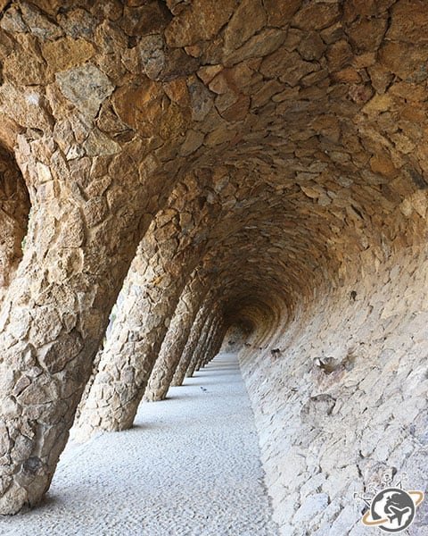 Partout, et comme d’habitude, on retrouve les formes organiques de la nature, chères à Gaudí. En particulier l’absence de lignes droites. Nous l’avions déjà vu à la Sagrada Familia puis dans la Casa Batlló. Le Park Güell ne fait évidemment pas exception à la règle. On le voit bien sous le joli Portique de la Lavandière (à gauche) et au milieu des grandes colonnes de la Salle Hypostyle (milieu et droite).