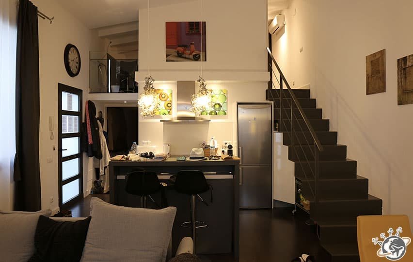 Le loft Miró se trouve dans le quartier de Sants, un quartier résidentiel tranquille, idéal pour nous, et très bien desservi. Il est bien caché, au fond de la petite cour d’un immeuble. Bonne nouvelle, il est exactement comme sur les photos. Et c’est plutôt cool.