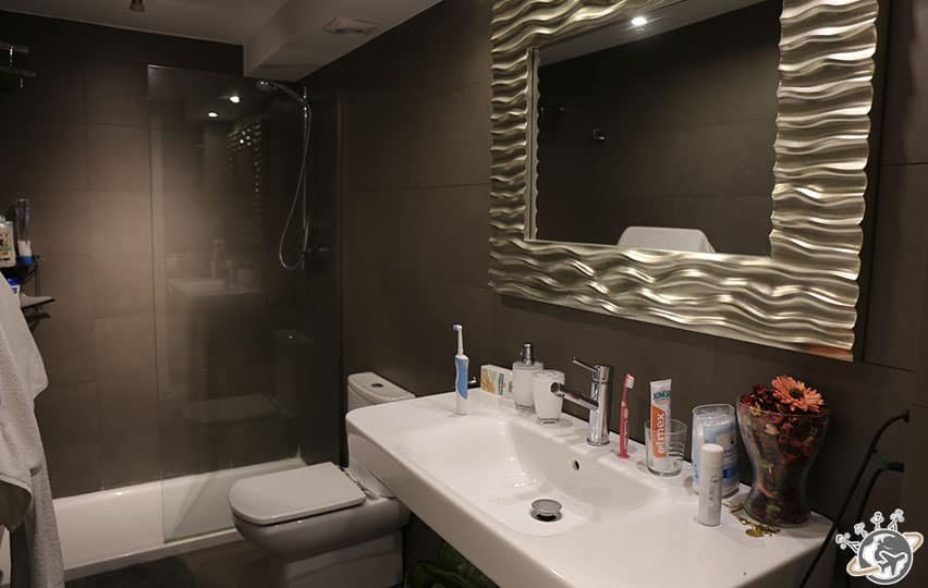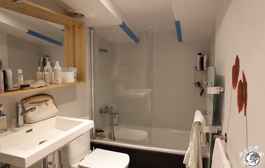 En haut, notre chambre et la salle de bain. Seul point négatif de cette location, le propriétaire ne laisse pas de bouchon pour la baignoire. Il doit penser qu’on va prendre 18 bains par jour !!! Pas très grave mais mesquin étant donné le prix de notre séjour (un peu plus de 900 € pour les 5 nuits).