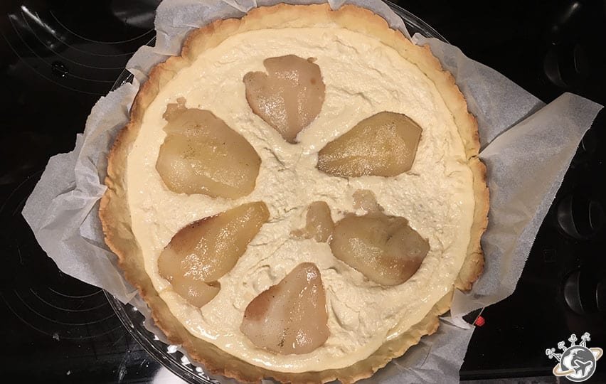 Verser la préparation aux amandes sur le fond de tarte, poser les poires dessus en les enfonçant un peu et faire cuire 30 min à 180 C.