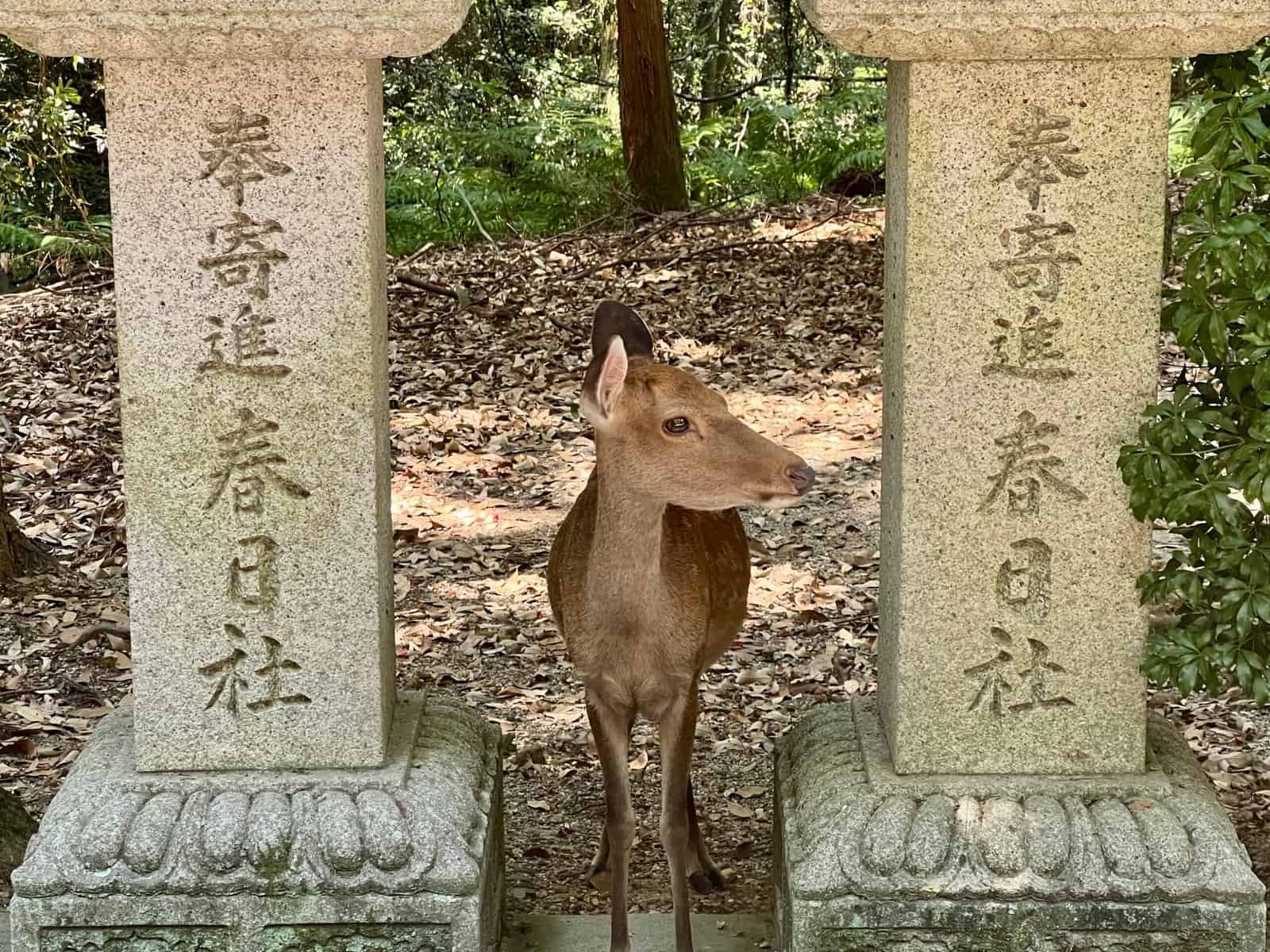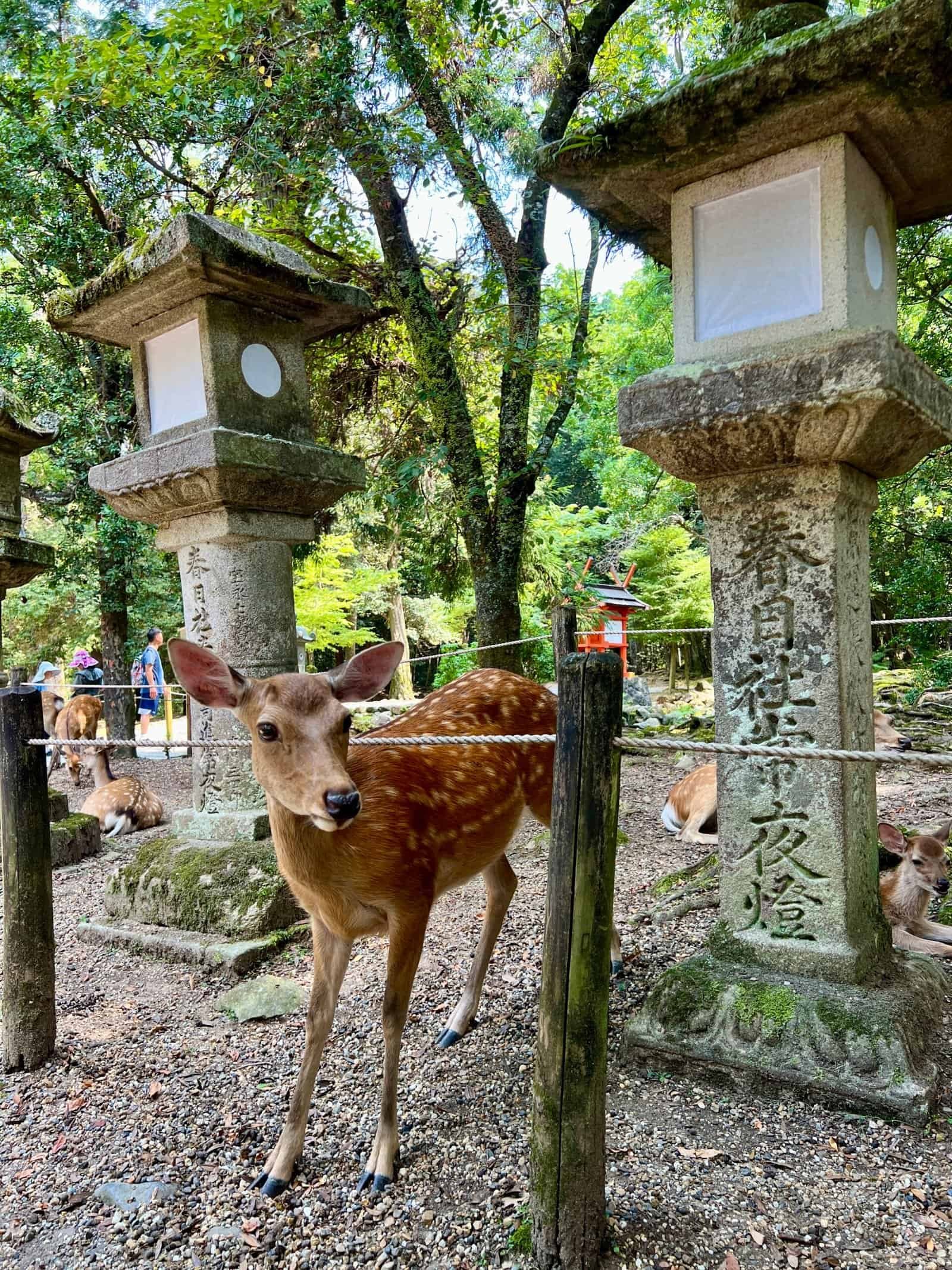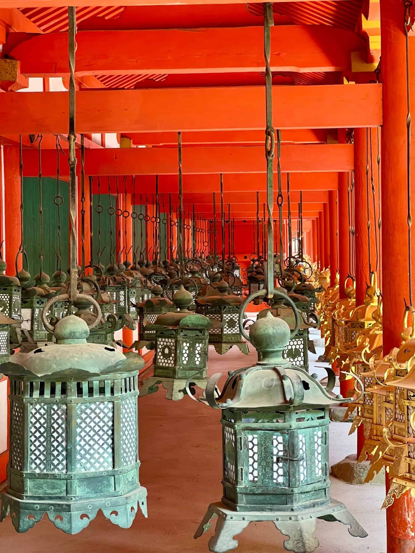 À 15 minutes de marche du Todai-ji, le sanctuaire shinto Kasuga Taisha est beaucoup plus paisible. Ses centaines de lanternes en pierre et en bronze, sa forêt attenante, ses sentiers ombragés en font un lieu poétique et apaisant.