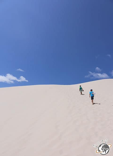 Nous continuons jusqu’à Lagoa Azul (la lagune bleue), « petite » piscine entourée de pentes de sable, parfaits toboggans naturels pour Nains en délire.