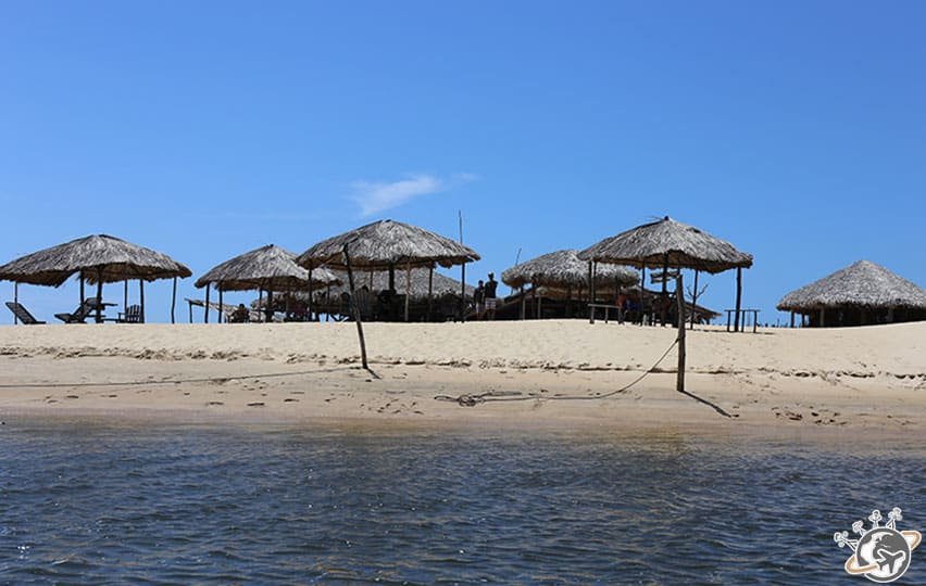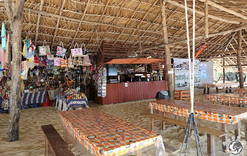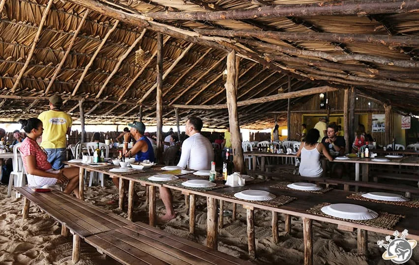 Nous reprenons le voadeira pour Caburé, une bande de sable incroyable de 200 mètres de large entre fleuve et mer. C’est là que sont posées plusieurs paillotes sur le sable – très – chaud. Notre restaurant est sous la grande, de plus petite abritent les indispensables hamacs.