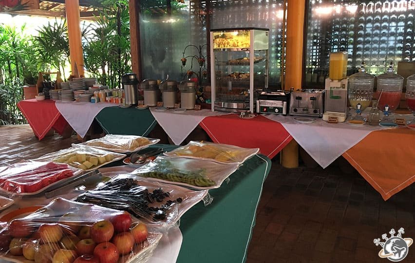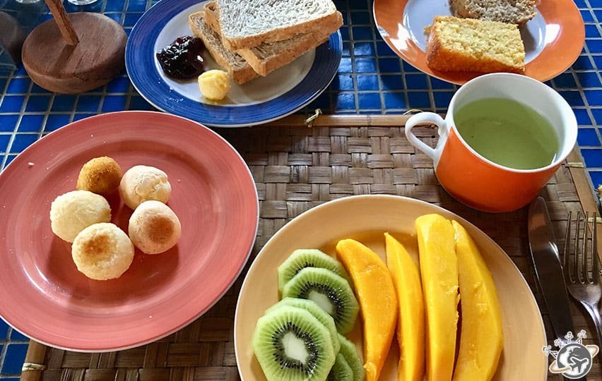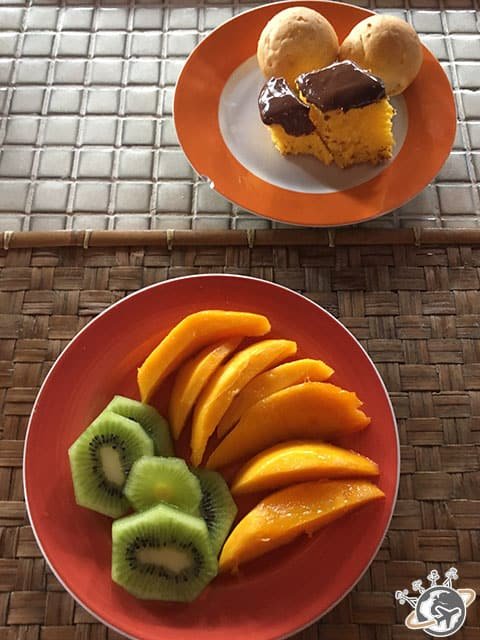 Le plaisir des yeux continue au buffet où nous découvrons de nombreuses spécialités brésiliennes comme les pao de quejo (petites boules de pain nature ou au fromage) ou le carrot cake sans épices (mon préféré) et un festival de fruits : mangues, kiwis, ananas…