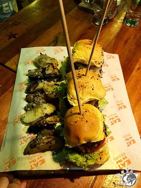 Le soir, après l’allée de la soif, les Nains ont choisi de manger des Burgers. Nous sommes donc allés chez « Eat on the Streets » dont la carte proposait un trio de mini-burgers à choisir dans la liste des gros. C’était visiblement une table appréciée car en moins de 2 c’était complet (bon ok il n’y avait que quelques tables).