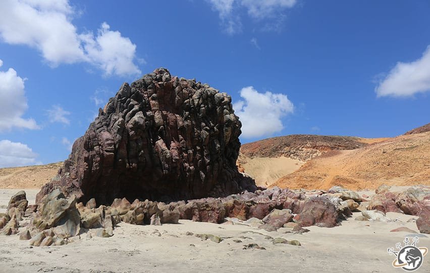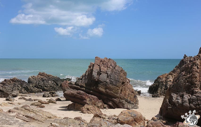 Le chauffeur nous abandonne sur un « parking » où se trouvent déjà de nombreux (mais alors nombreux) Buggys (ça change de Camocim). De là, il faut compter environ 30 minutes de marche un peu sportive en bord de mer. Il faut escalader des gros cailloux sous un soleil déjà de plomb. C’est une des rares fois où nous avons ressenti la chaleur.