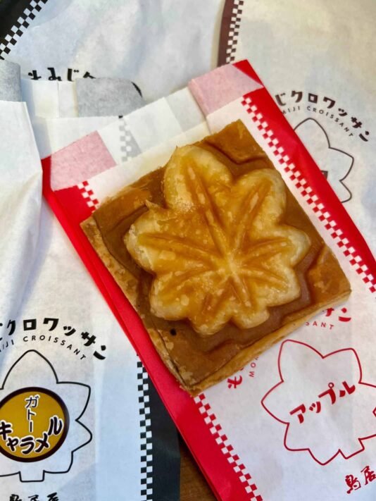 On enchaine avec un jus de fruits (combo fruits rouges pour les garçons, kiwi pour moi), et l’autre spécialité de l’île, les momiji manju, des gâteaux en forme de feuille d’érable. Pas mal du tout.
