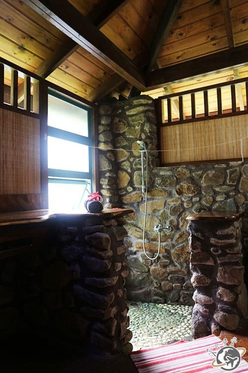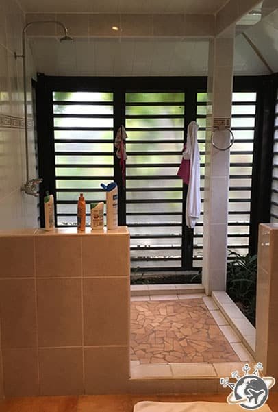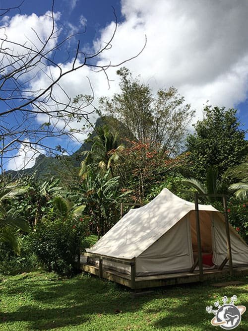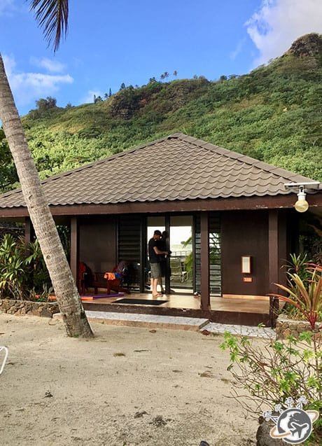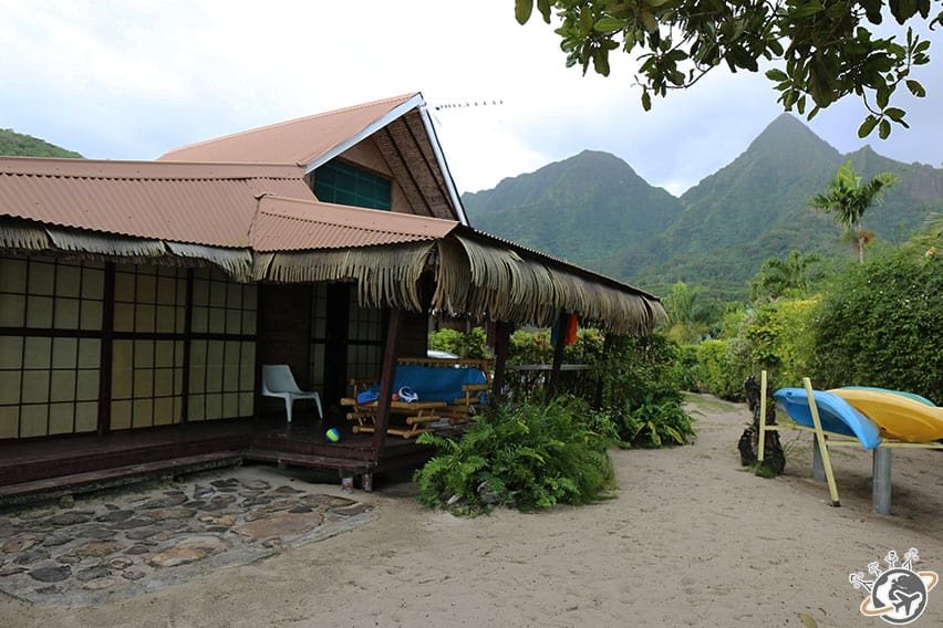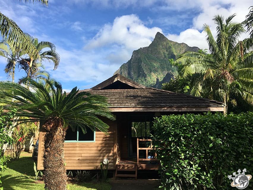 On change complètement de décor en s’éloignant de la mer. Le Village Temanoha est situé dans la baie de Cook, sur les terres ancestrales du Pacifique. Après 5 jours en bord de mer, nous nous sommes un peu éloignés pour passer notre dernière nuit dans la nature… Enfin proches de la nature. C’est un lieu atypique et unique à Moorea, avec une vue imprenable sur la Montagne percée.