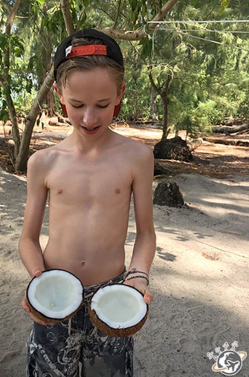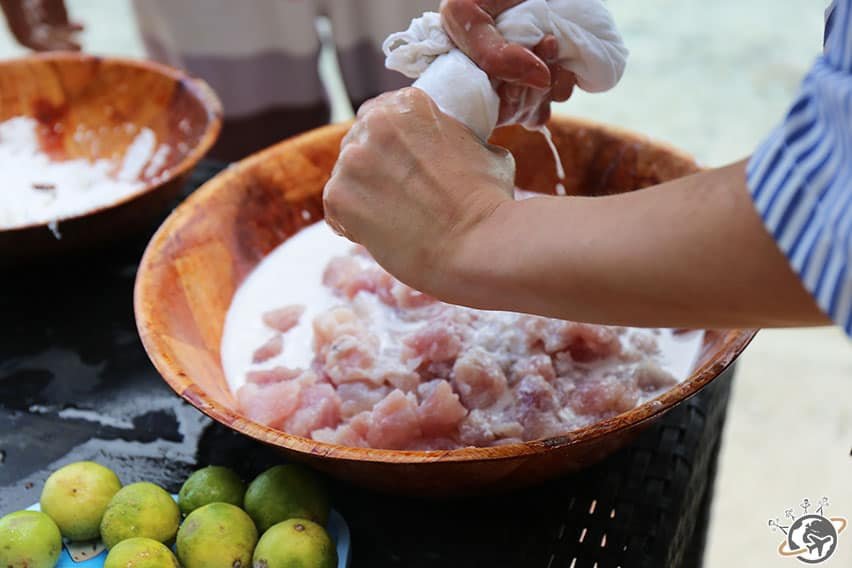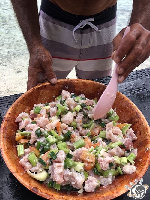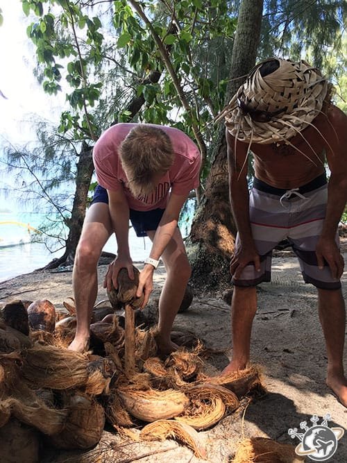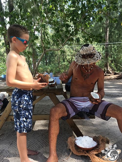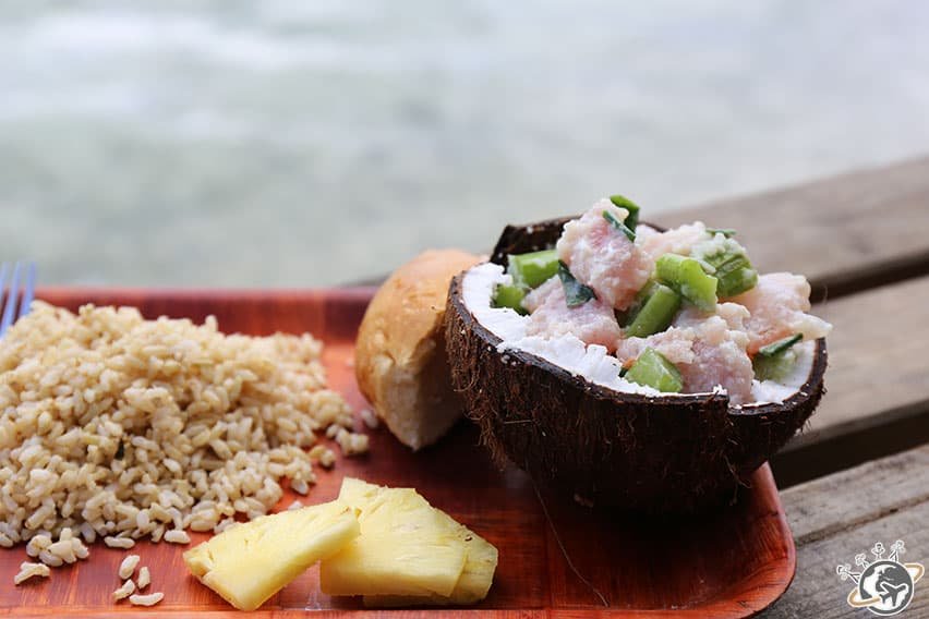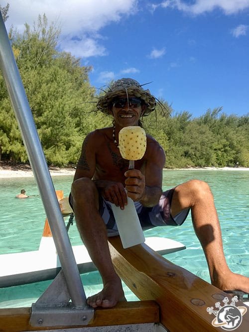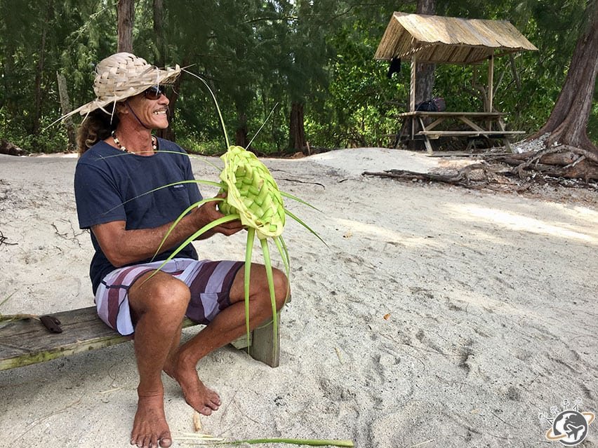 … atelier cuisine poisson cru au lait de coco, dégustation sur une île déserte, tissage de chapeau en feuilles de cocotiers… le tout sur fond d’histoire de l’île, de ukulele et d’ananas polynésien. Vous connaissez ? Non ? C’est de l’ananas fraîchement découpé juste trempé dans le Pacifique 🙂 .