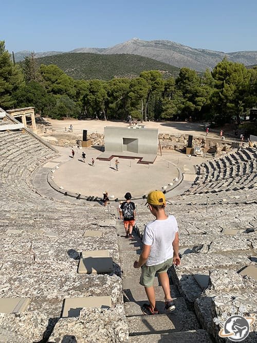 Le théâtre est incroyable de conservation pour un truc construit au IVème siècle av. J.-C. (il a bien bossé Polyclète le Jeune :)). Nous nous sommes installés tout en haut des 55 rangées de sièges qui surplombent la scène de 20 mètres de diamètre.