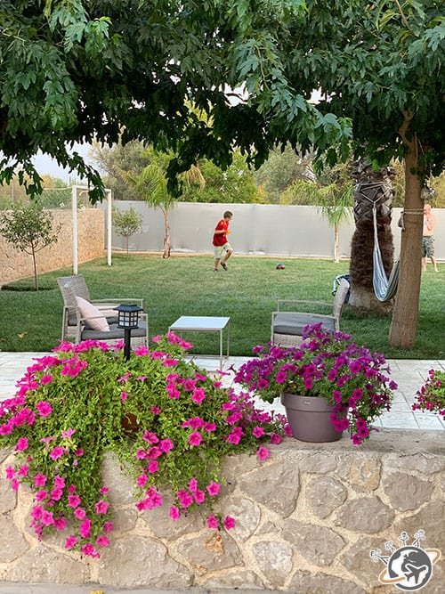 Et elle était parfaite : 2 chambres, un salon, une cuisine équipée, la clim. Je ne suis pas une dingo de la clim mais là franchement, c’était indispensable car il faisait plus de 40 degrés en fin de matinée. Les enfants ont également adoré le jardin équipé de buts pour jouer au foot.