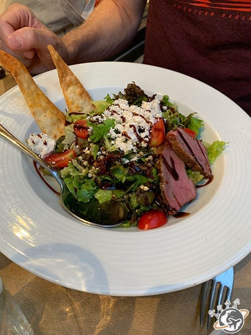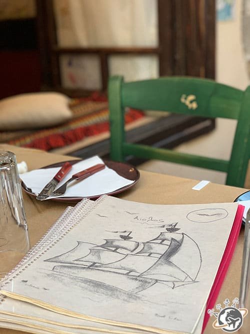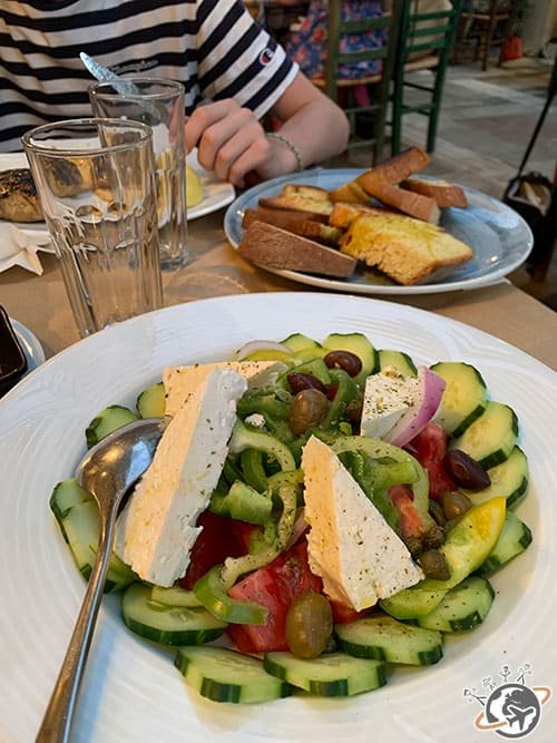 Je vous conseille de regarder les menus et de fuir quand elles sont trop longues. J’en avais évidemment repéré quelques-uns en ligne. Le premier était au milieu d’une ruelle très étroite, bof. Le second, Aiolos Tavern, est dans la rue Vasilissis Olgas, plus agréable. Tous nos plats étaient bons et copieux (comme souvent en Grèce).