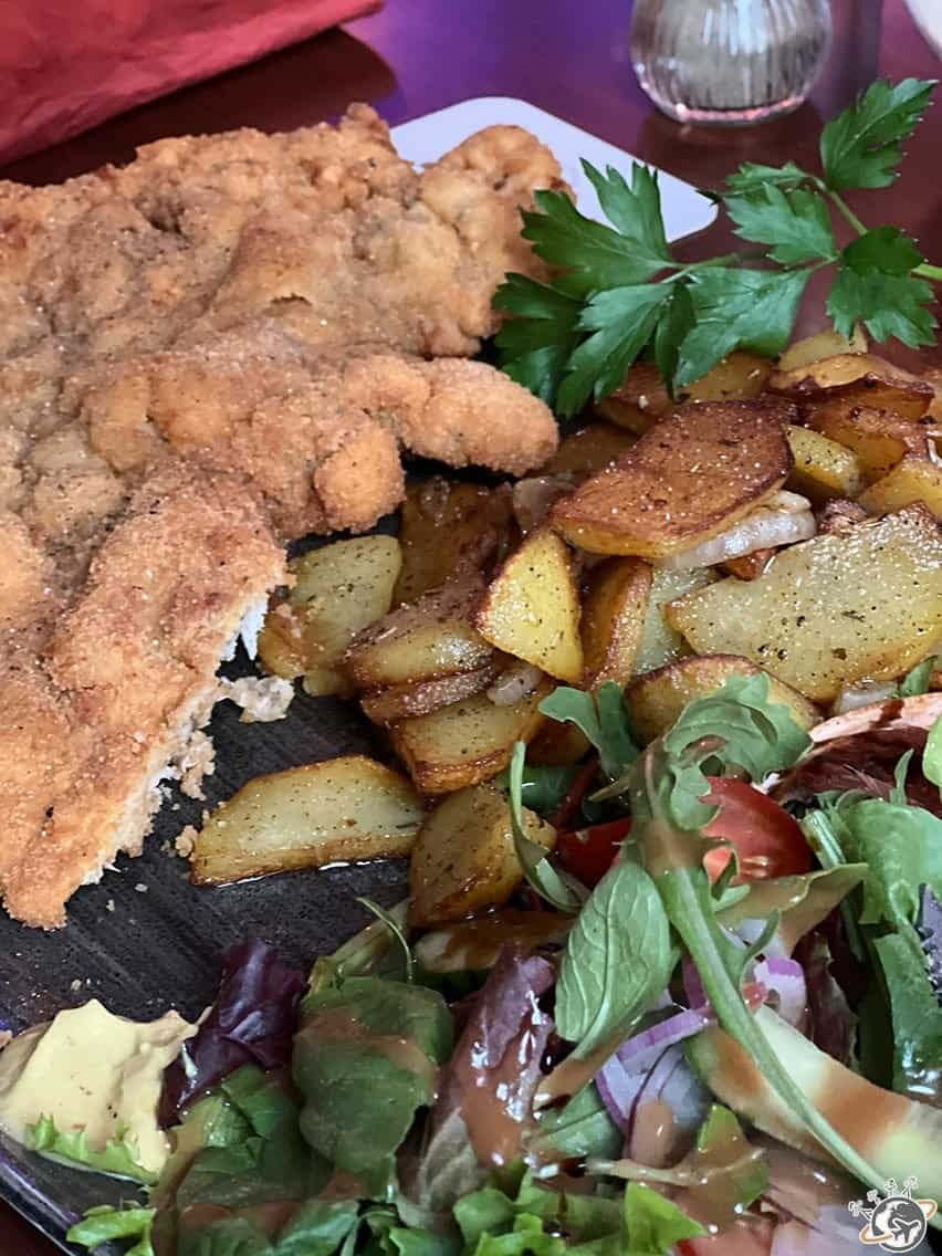 Une fois installés, nous sommes allés dîner chez Kielär, un restaurant qui n’a sans doute pas été « redesigné » depuis… 25 ans et qui m’a fait penser à ceux que je fréquentais quand j’étais étudiante en Allemagne (j’y ai passé 1,5 an pendant mes études). Et bien contre toute attente, nous avons très bien mangé : pizza pour les ados, schnitzel (spécialité autrichienne mais qu’on trouve beaucoup ici aussi) pour Népoux et une salade parfaite avec groseille, tomates et concombres pour moi. Mon allemand était un peu rouillé mais on a réussi à se faire comprendre. Un moment très agréable au rythme d’une super playlist au milieu de laquelle se sont invitées Desireless et Zaz. Népoux et moi n’avons pas pu nous empêcher de chanter à tue-tête devant nos ados plus amusés que honteux 😀