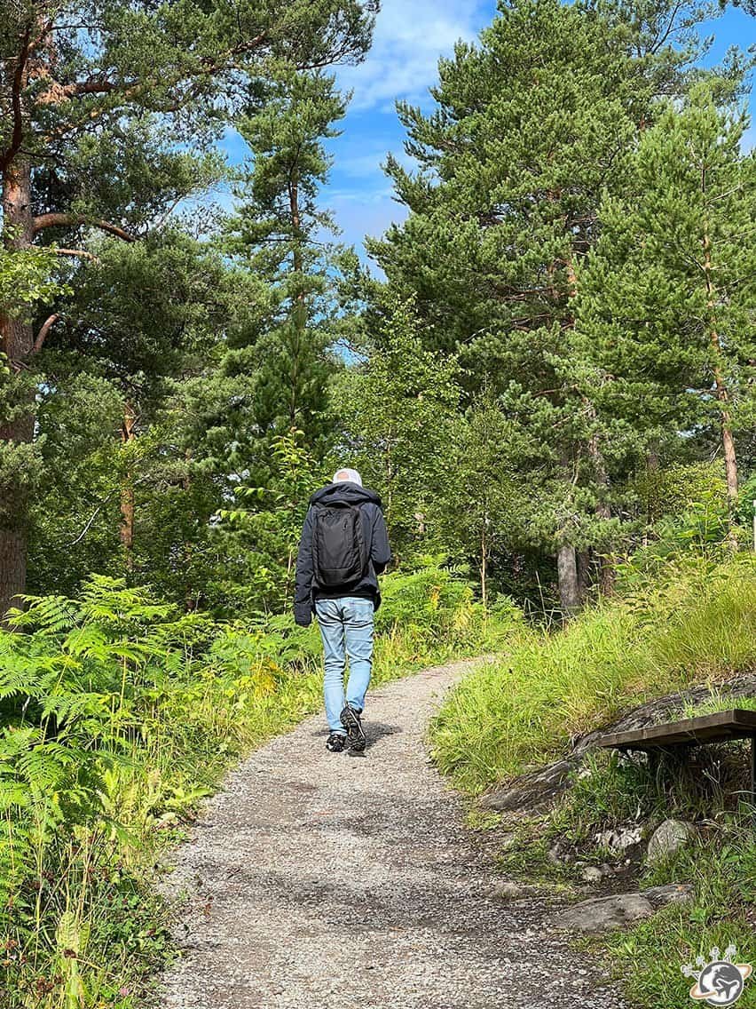 Nous avons quitté Paris sous un soleil radieux et une température frôlant les 20 degrés à 8h. Les nuages se sont amoncelés durant tout le trajet et la pluie s’est jointe à la fête peu de temps avant notre arrivée. Ô joie bonheur. Le temps s’annonçant frais et pluvieux en Norvège, nous étions équipés mais nous n’avions pas prévu la longue côte en haut de laquelle se trouvait notre Airbnb ! Nous ne le savions pas encore mais c’était en fait la thématique de ce voyage : gravir des côtes ou des montagnes !