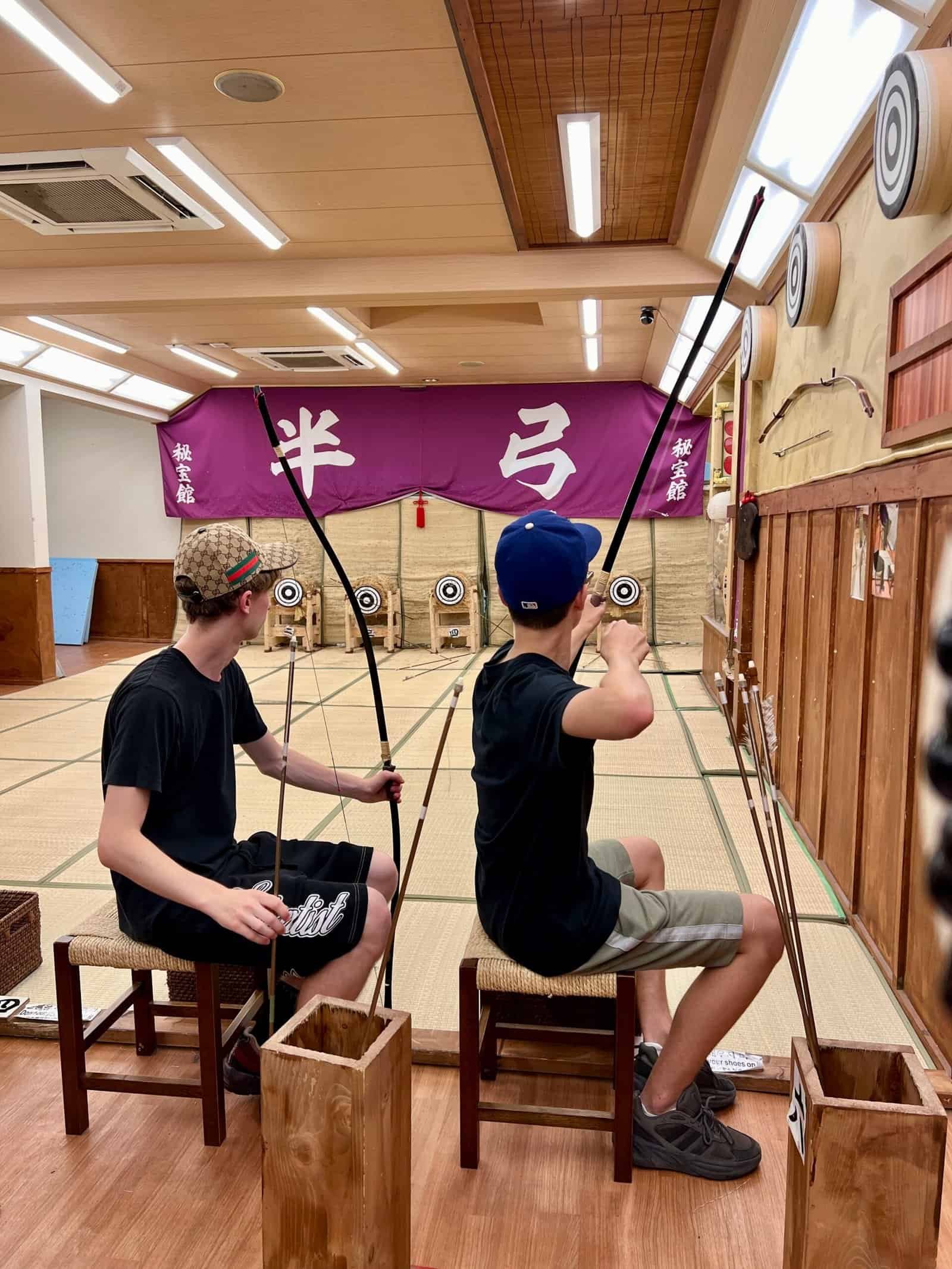 On commence par… du tir à l’arc ! Un stand propose pour quelques yens de s’essayer à ce sport ancestral. Les ados et Népoux prennent place, entourés de Japonais très concentrés. Aucune prouesse, mais beaucoup de rires. Et quelques flèches perdues.