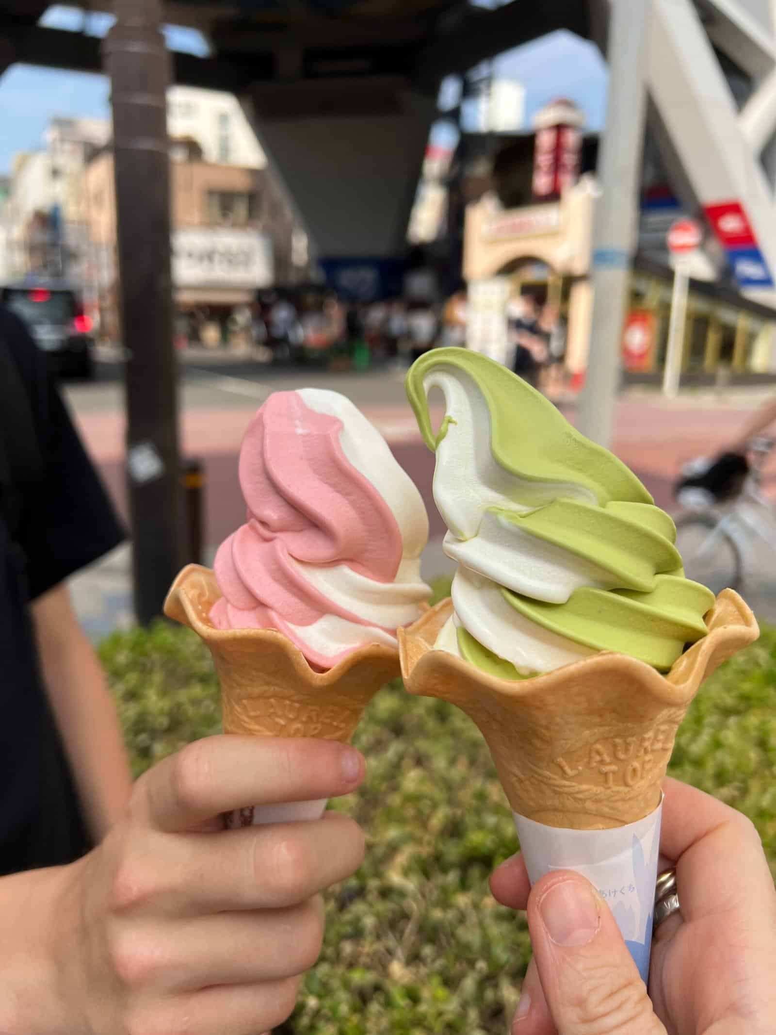 Juste après, on craque pour une glace chez un vendeur ambulant : vanille-fraise pour les garçons, matcha-vanille pour moi. Verdict ? Pas convaincue. Le matcha, définitivement, ce n’est pas pour moi.