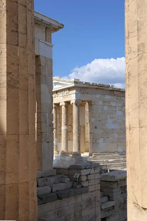 A droite le joli temple d’Athéna Niké, en face l’arrière du Parthénon et un peu plus loin sur la gauche l’Erechthéion. Là on est sur du waouh et beaucoup d’histoires à chaque étape. Les touristes sont nombreux, les guides se succèdent devant les monuments mais ça reste vivable car il est encore tôt.