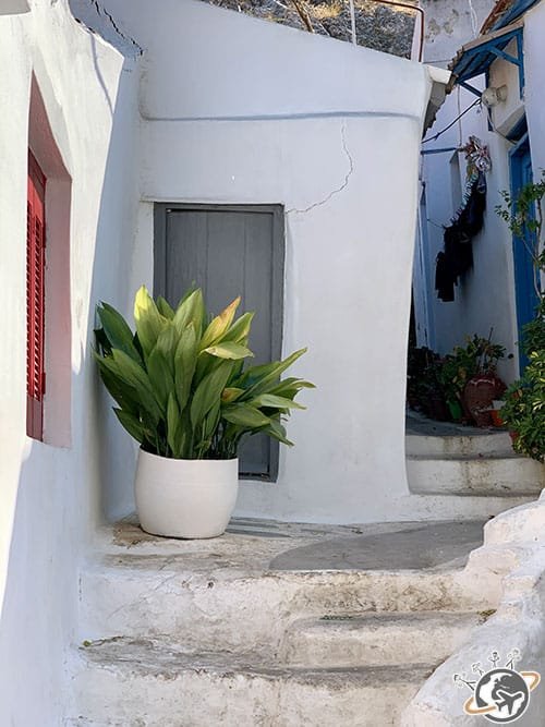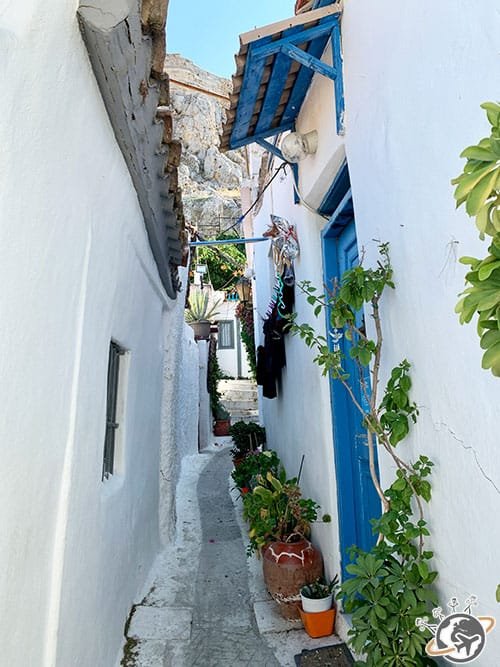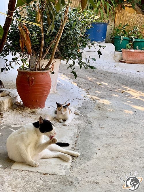 Si les ruelles de Plaka ne sont pas très larges, celles-ci sont plus qu’étroites et biscornues. Et c’est ce qui fait son charme. J’ai lâché les garçons pour me perdre dans ce dédale pavé de gris bordé de blanc. Les maisons blanchies à la chaux sont collées les unes aux autres, certaines ont des volets bleus, d’autres ont de drôles d’objets dans leur « cour ». Les chats s’y prélassent tranquillement tant le lieu est calme et propice à la sieste.