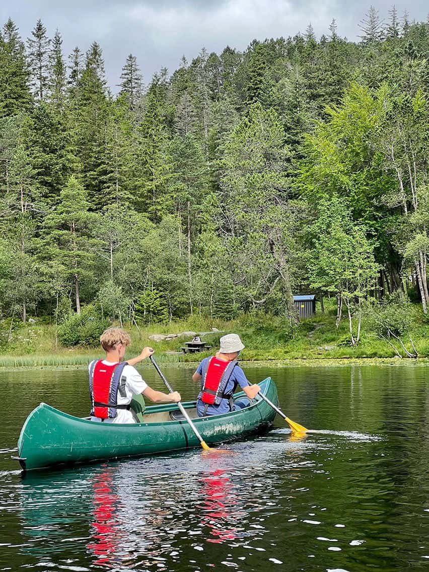 Arrivés au lac, nous avons enfilé nos gilets et embarqué sur nos canoés, les nados d’un côté et les parents de l’autre. Après 10-15 min de course-poursuite dans tous les sens (alors que les autres faisaient sagement le tour), nous avons restitué le tout puis sommes allés prendre un café et un roulé cannelle au Skomarkerstuen (jpp des noms norvégiens). Ce n’est pas le meilleur qu’on ait goûté, mais il a permis de caler un petit creux du 17 ans.