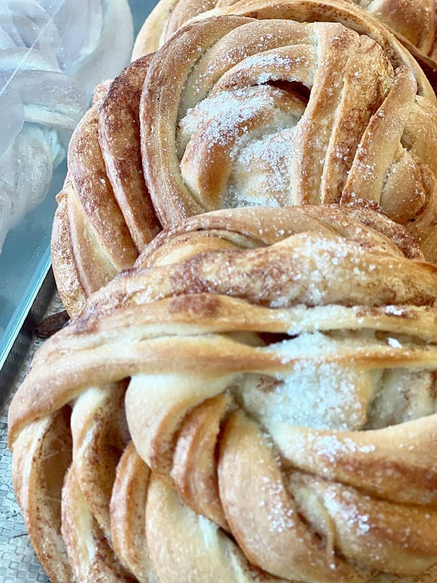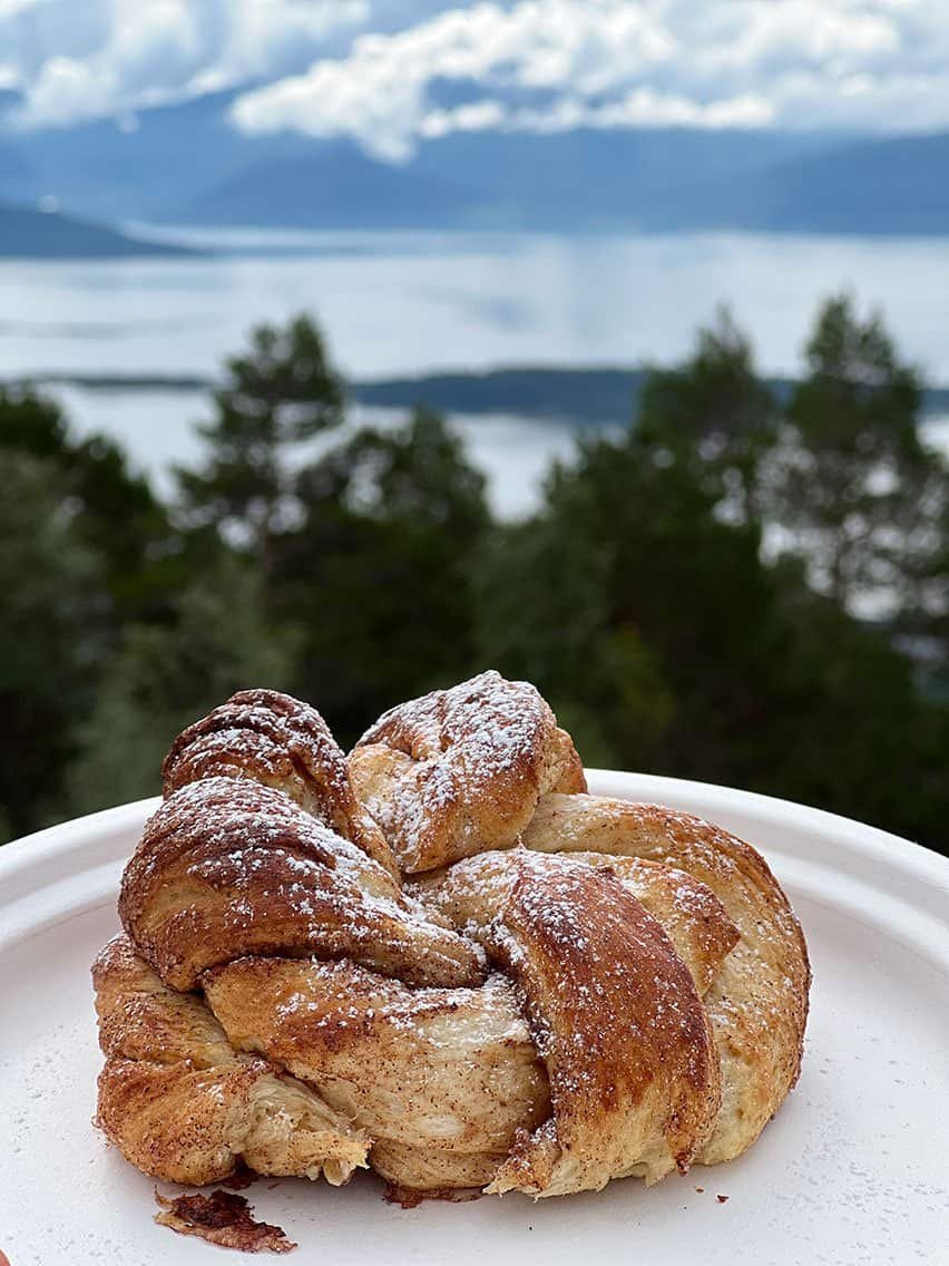 Dès notre arrivée, la bonne odeur de cannelle, puis la vision de la brioche sortant du four me confirment que je tiens là un bon candidat. Ce que la dégustation avec vue sur le fjord a confirmé ! C’est une adresse qui aurait pu être top pour déjeuner, car tout avait l’air délicieux (mais c’était trop tôt pour nous).