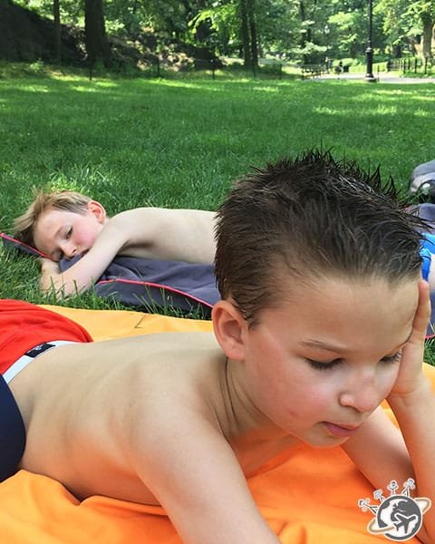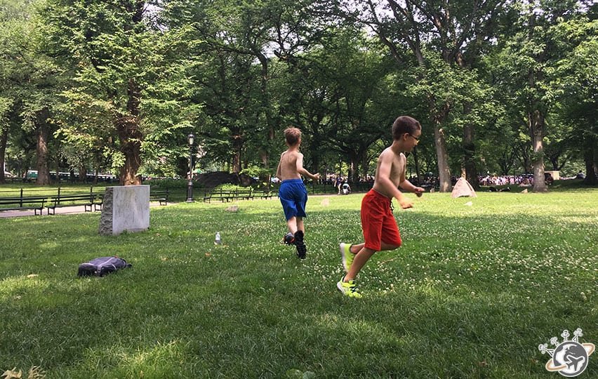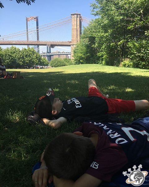 J’avais prévu une balade dans le Brooklyn Bridge Park et ses environs. La chaleur était telle que nous avons trouvé un coin à l’ombre et nous n’avons plus bougé. Les Nains ont ensuite commencé à jouer au foot quand 2 petits Américains sont arrivés en demandant s’ils pouvaient jouer avec eux.