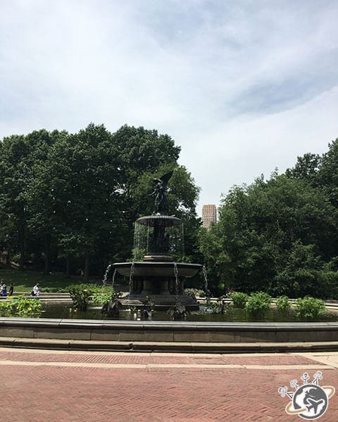 Juste à côté, pause photo près de la statue d’Alice au pays des Merveilles puis nous sommes retournés près du Pain Quotidien pour le déjeuner. En chemin, nous sommes passés devant la fameuse fontaine Bethesda, qui a laissé les Nains de marbre puis devant un restaurant qui diffusait le match du jour, ce qui les a beaucoup plus intéressés (et moi pas du tout). Re-pelouse à l’ombre, re-foot.