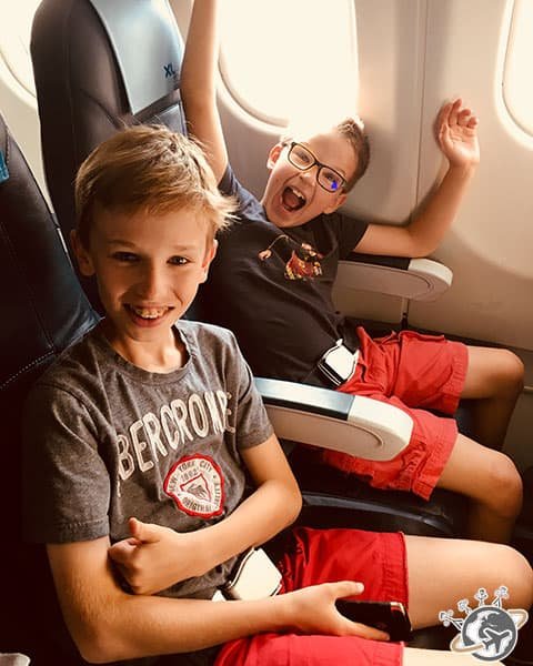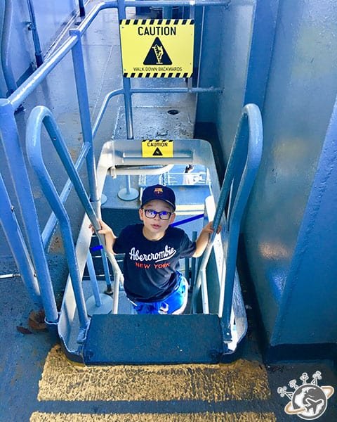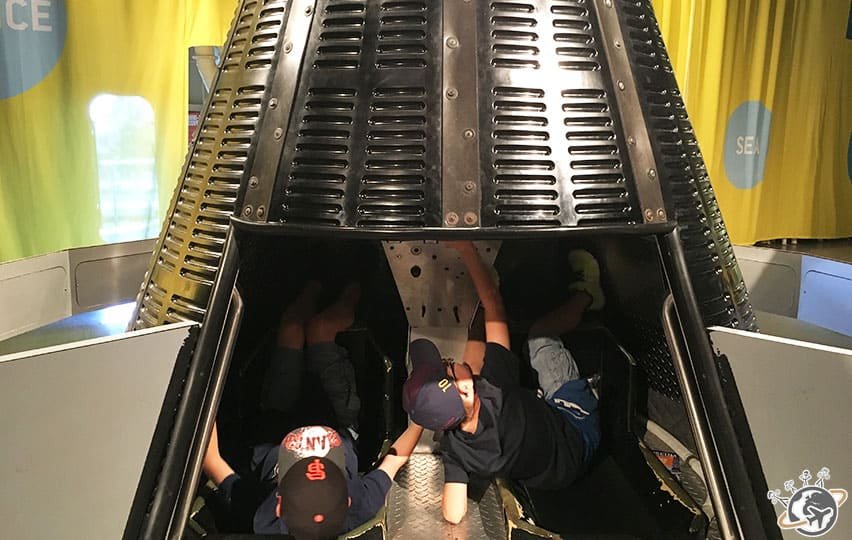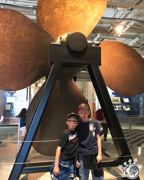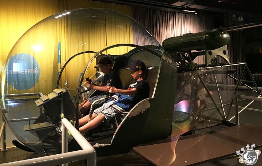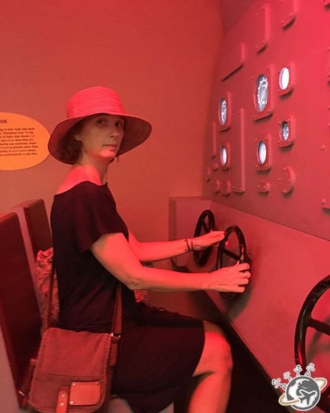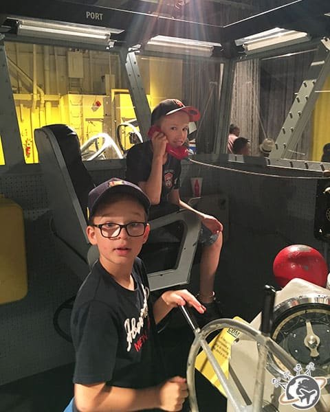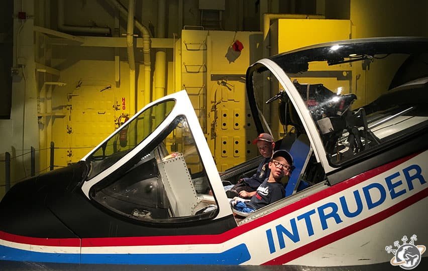 Il y avait aussi 2 capsules qui permettaient – moyennant 12 dollars – de ressentir les mouvements d’un vrai avion. Les Nains ne l’ont pas fait – je n’étais pas sûre que Petit Nain le vivrait bien – mais ils ont vu le film en 4D “Stories of Intrepid” et ont été secoués comme des pilotes. Ils n’ont pas compris ce qu’ils racontaient mais les images et les mouvements du siège suffisaient.