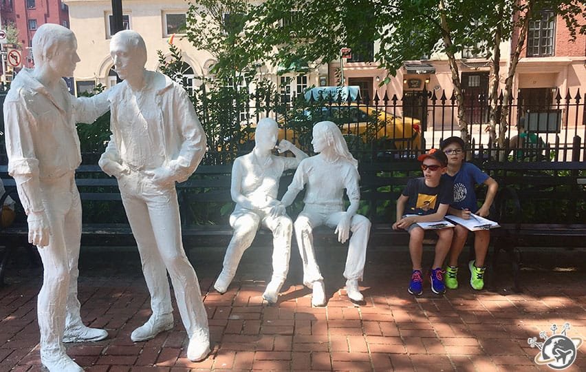 Puis les Nains ont joué à un petit jeu à Christopher Park devant les statues blanches commémorant les évènements du Stonewall Inn. Petit Nain a largement perdu 🙂