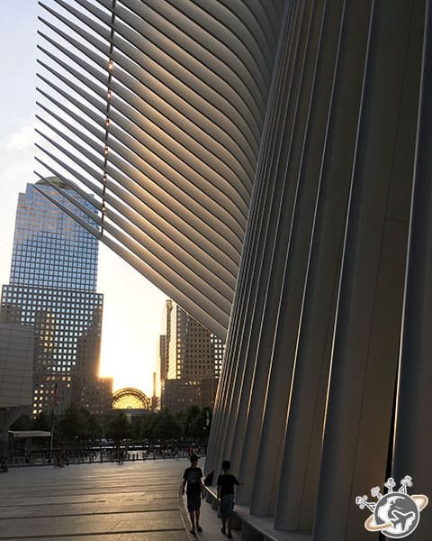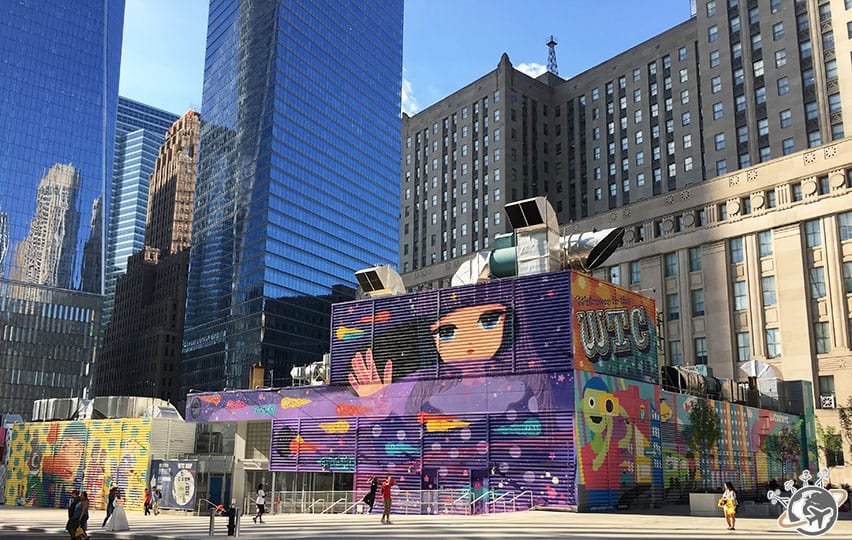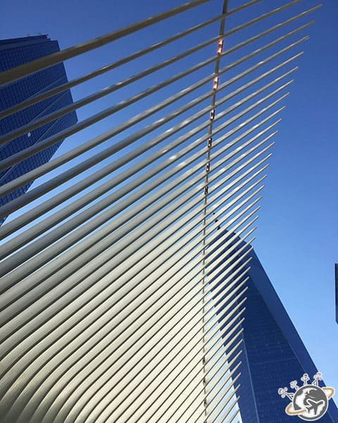 C’est également incontournable quand on va à New York. Avant d’aller voir les bassins, nous sommes rentrés dans l’incroyable gare du World Trade Center, l’Oculus, dessinée par l’architecte espagnol Salvator Calavatra. Juste à côté, quelques oeuvres de street-art et en toile de fond la fameuse One World Trade Center.