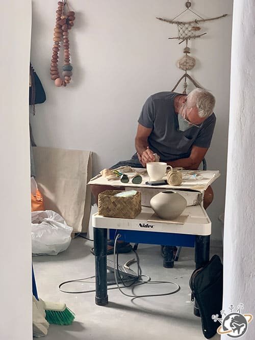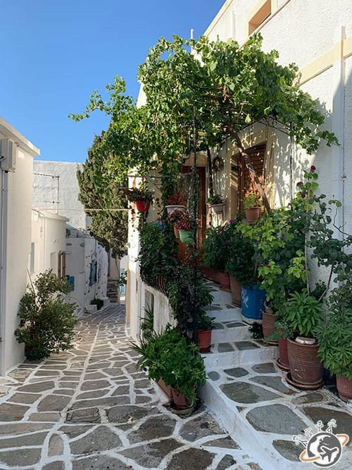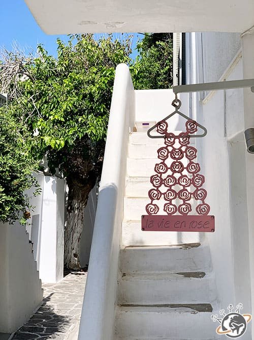 Nous avons déambulé – rapidement – dans ses petites ruelles pavées de marbre pas vraiment régulières, entre ses maisons blanches ornées de petits moulins ou de bougainvilliers roses. On découvre ici et là un atelier de céramiste ou une petite boutique mais pas de voitures, c’est bien trop étroit.