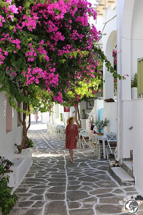 C’est écrit partout et c’est vrai ! Naoussa c’est la carte postale, le petit port trop mignon à ne pas louper. J’ai adoré nous perdre dans le labyrinthe de ses ruelles pavées de gris bordées de maisons bleues et blanches avec des pointes roses de bougainvilliers.