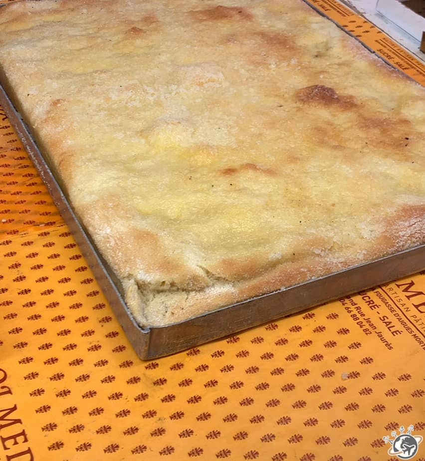 La fougasse est présentée sur sa plaque et on l’achète en entier, demie, quart ou 1/8e. Allons-y pour la demie.