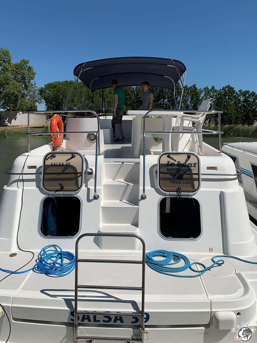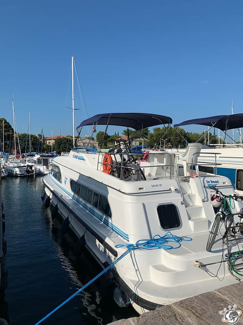 Après avoir pris connaissance de l’itinéraire conseillé par Le Boat, nous avons pris possession de norte Salsa B. Comprenez mettre les valises et les courses sur le pont arrière puis dans le salon via les sabords des cabines arrière ou via le pont supérieur quand c’était trop gros.