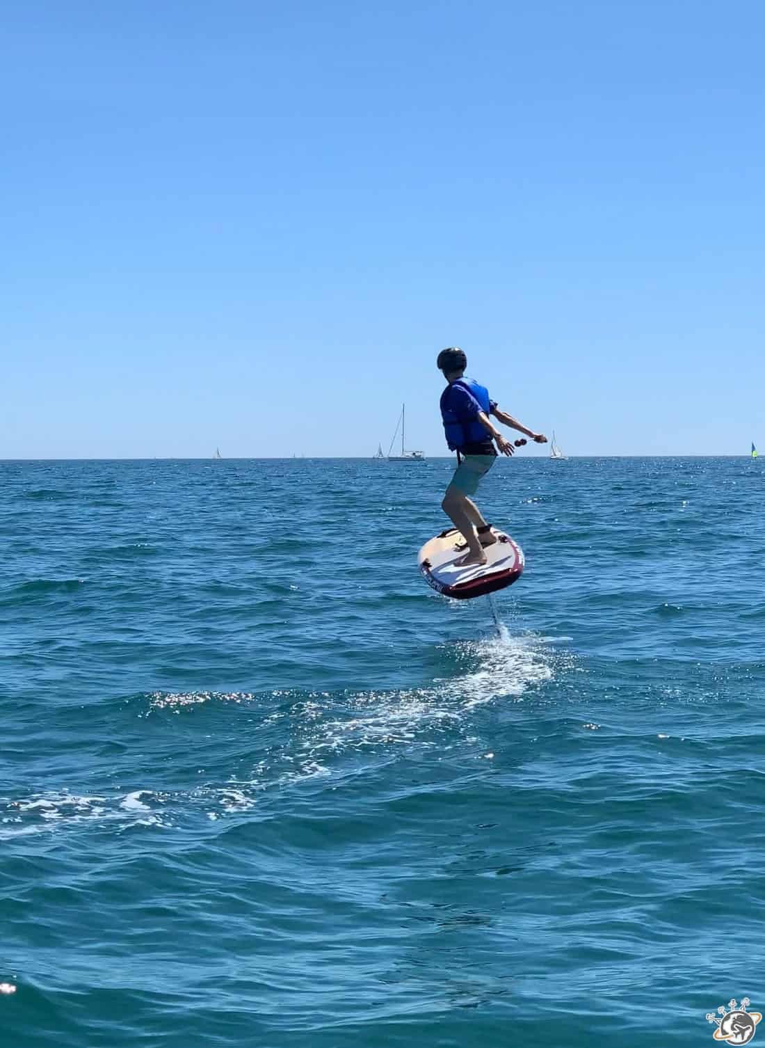 Les « grands » ont donc testé l’e-foil, une sorte de planche de surf avec une dérive… c’est un peu la dernière activité tendance. Ils ont littéralement volé au-dessus de la mer, sans vent ni vagues. Il y a eu quelques belles chutes avant qu’ils comprennent le truc mais les deux ont performé ! Trop bien.