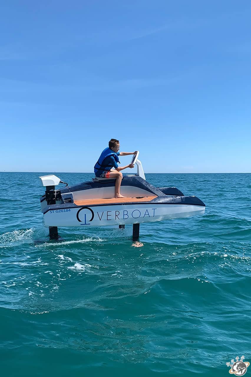 Le 12 ans et moi avons préféré l’Overboat, un jet ski électrique, et donc écologique, qui se pilote très facilement et permet de voler en quelques secondes. On peut dire que c’est la version fainéant de l’e-foil !