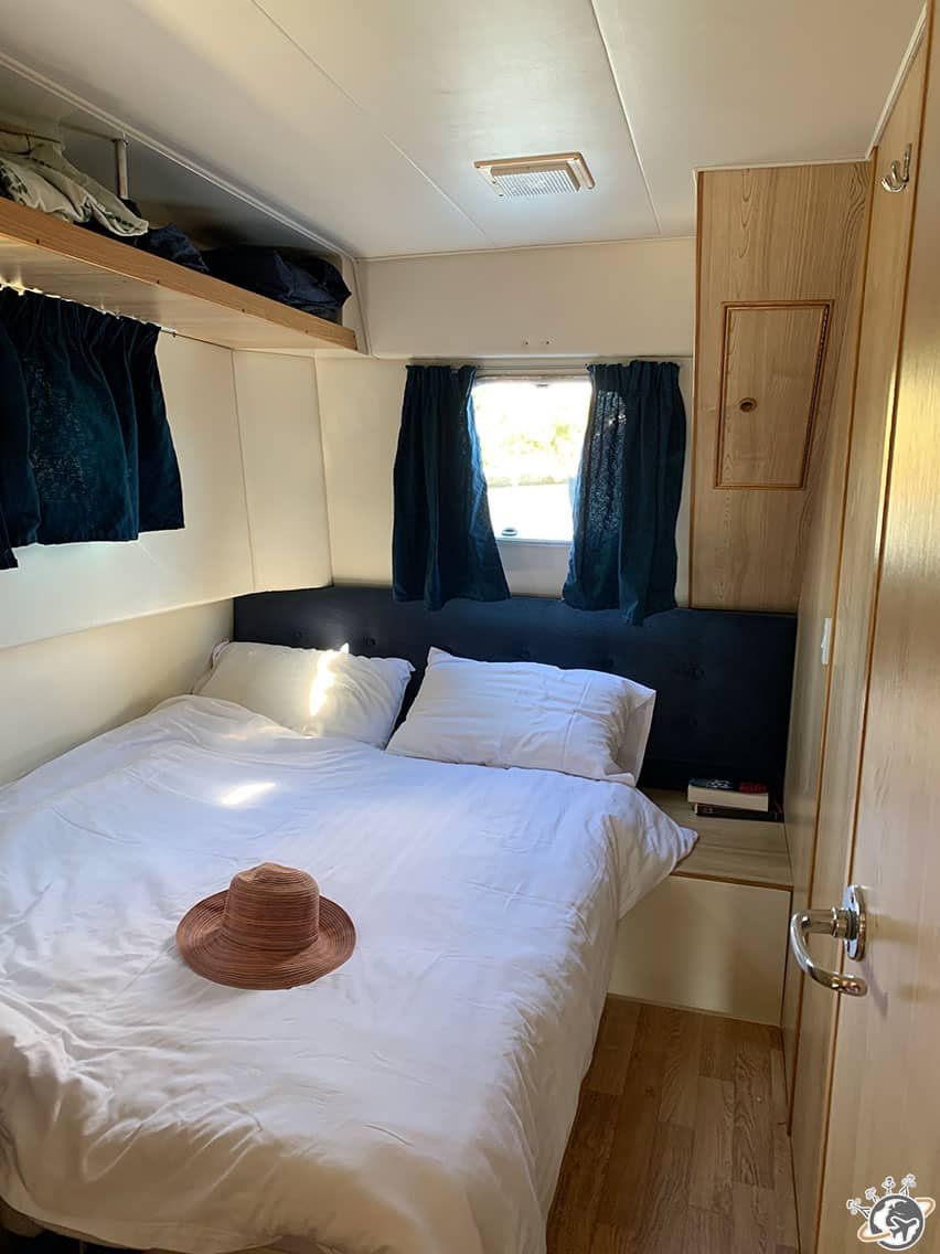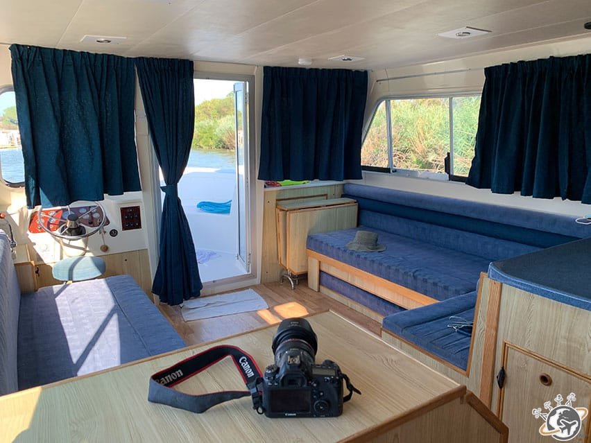 Le poste de pilotage principal se trouve en haut. Derrière se trouve des banquettes et une table pour les repas et de la place pour stocker les vélos.