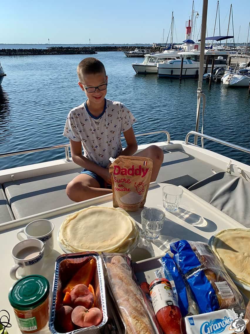 Après Marseillan, Marseillan Plage, à environ 30 minutes de bateau. Mais avant ça, petit déjeuner-crèpes faites maison par le mari des amis. C’est qu’il faut prendre des forces avant d’aller… à la plage !