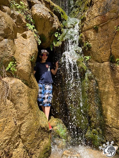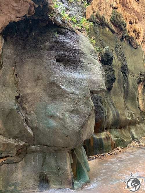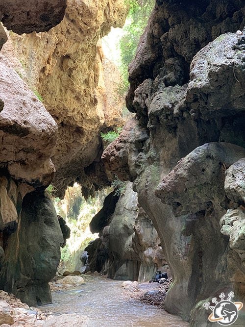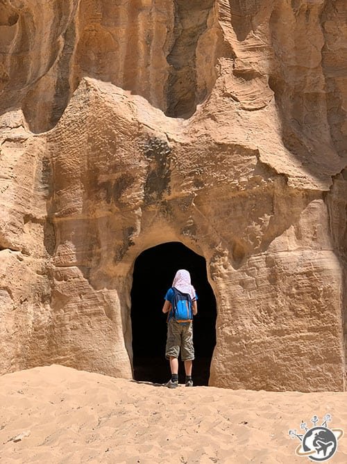 Un peu plus loin, nous avons découvert de magnifiques cavités aux nombreux dégradés de jaune, rose, rouge et marron. Mazen nous a expliqué que ce sont les sels minéraux qui ont donné ces différentes couleurs. Je n’en ai retenu qu’un, le rose, évidemment, qui provient de l’oxyde de fer. En vrai, ce sont de super peintures de guerre pour les enfants.