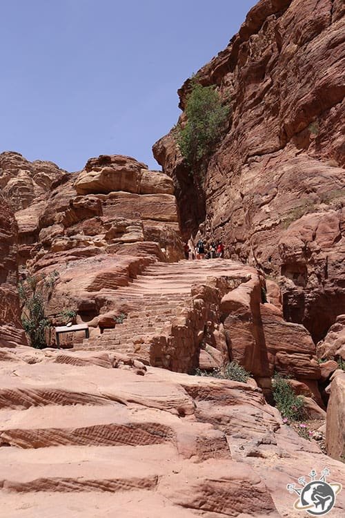 La descente est plus facile mais attention au pas de travers, ça glisse. Surtout pour les imprudents qui grimpent en sandales. Oui oui en sandales, il faut être stupide ! On est redescendus tous les trois, sans âne évidemment. En bas des marches, Mazen nous a annoncé entre 1h15 et 1h30 pour regagner la sortie. Ça nous a paru bien long alors on a mis le turbo. C’est là qu’on a pu voir la façade au trésor sans personne, ou presque. Pareil dans le défilé ! La dernière partie a été la plus difficile, on en avait vraiment plein les jambes.