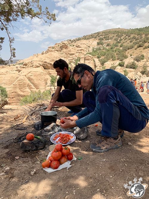 Hamad a sorti la casserole et la théière, nous avons découpé les tomates qu’il a ensuite fait chauffer avec quelques épices. En 10 min nous avions notre pain pita à la tomate et un verre de thé. On ne s’est pas fait prier pour les engloutir face à une vue imprenable sur la réserve.