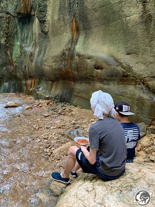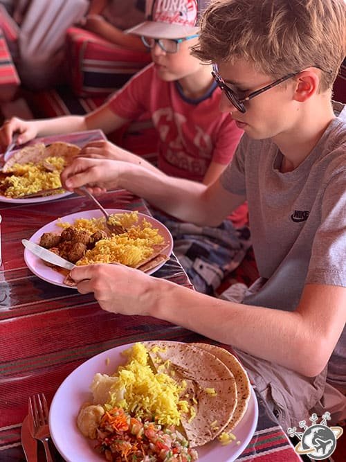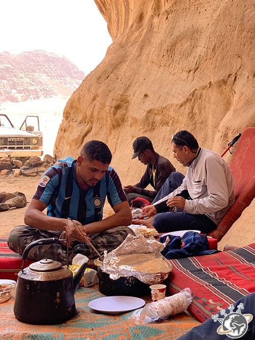 Au détour de tous ces imposants rochers se cache notre spot de déjeuner. Les bédouins du camp ont installé des nattes et des tapis au milieu d’une faille à l’ombre. Magnifique. On a enlevé les chaussures et on a commencé comme d’habitude par un thé. C’est fou comme on s’est vite adapté à cette tradition. Ont suivi les salades, le riz, les légumes assortis de pain pita, ça aussi on s’y est bien fait.