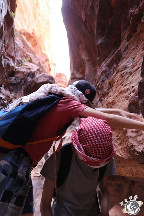 Uns fois arrivés au bord du canyon Wadi Bin Hammad, la touriste, moi, a ouvert toutes les valises pour trouver le short (issu du pantalon de trek), les chaussures d’eau, la crème solaire… Pas mieux pour le 16 ans qui s’est rendu compte que sa casquette était trop petite… Heureusement que j’avais des chèches. En deux temps, trois mouvements Mazen lui a noué sur la tête !